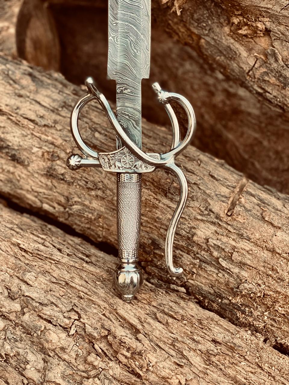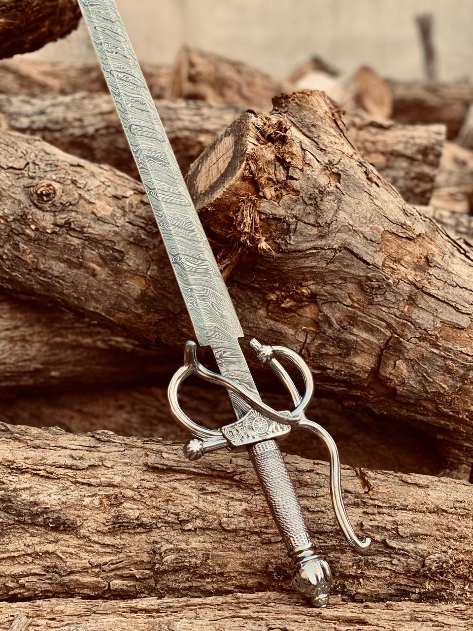 Each sword is hand forged by skilled artisans, featuring a stunning Damascus steel blade known for its strength, sharpness, and distinctive wavy patterns. The long, slender rapier blade offers excellent balance and precision, making it a striking display piece and a tribute to classic fencing swords of historical lore.