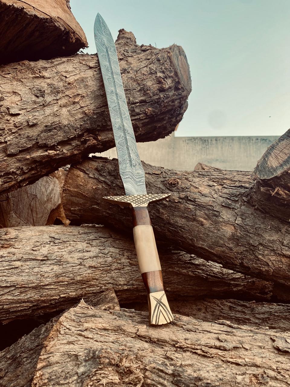 The Handmade Damascus Steel Camel Bone Handle Sword embodies tradition, durability, and elegance—an exceptional piece that celebrates the art of sword making.